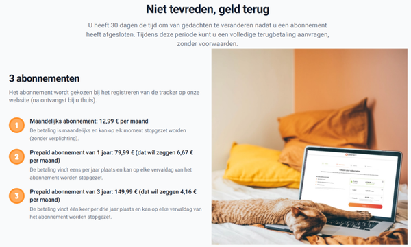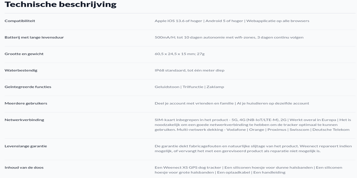 - Levenslange garantie: Weenect repareert of vervangt uw tracker, levenslang