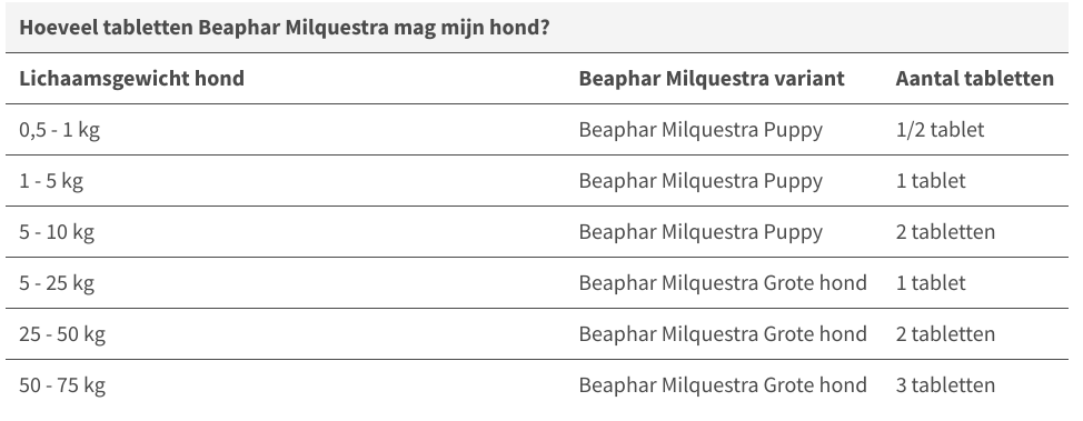 - Beaphar Milquestra Grote hond: Milbemycine oxime 12,5mg, Praziquantel 125mg