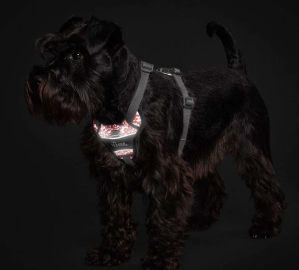 De rijke, heldere kleuren en de zilveren camouflageprint harmoniëren bijzonder goed met de vacht van de hond en trekken al snel nieuwsgierige blikken.